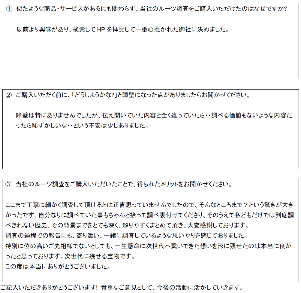 ルーツ調査のお客様の声、届きました。